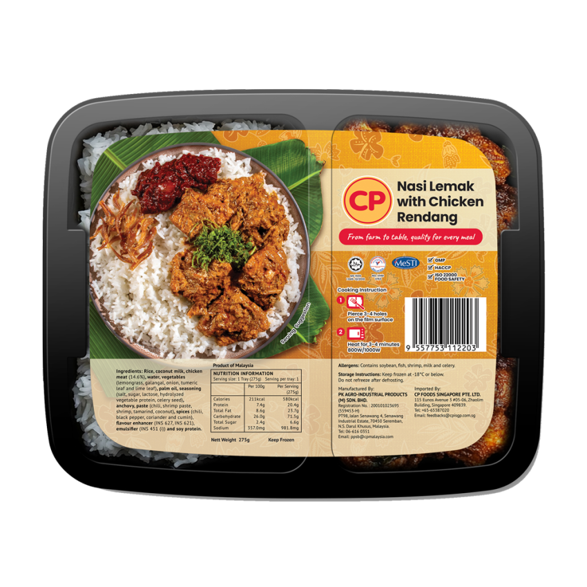Rice, Egg, Chicken Dims (Contains Sauce (Colour (E150c), Permitted Flavor Enhancer (E621, E631), Permitted Preservative (E211)), Bean Curd Sheet, Mushroom, Soya Protein, Celery), Chili Paste (Shrimp Paste, Chili, Onion), Vegetables (Carrot, Long Bean), Palm Oil, Anchovies, Seasoning (Lactose) and Sugar.