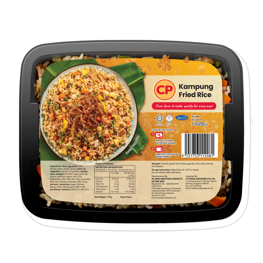 Rice, egg, paste (chilli, shrimp paste, onion garlic), palm oil, vegetables (carrot, long bean), chicken meat, bologna (chicken meat, palm fat, colour retention agent (INS 250), antioxidant (INS 300, INS 316), emulsifier (INS 451), flavour enhancer (INS 631)), anchovy, seasoning (sugar, chicken flavour, anticaking agent (INS 551))) and flavour enhancer (INS 627, INS 621)